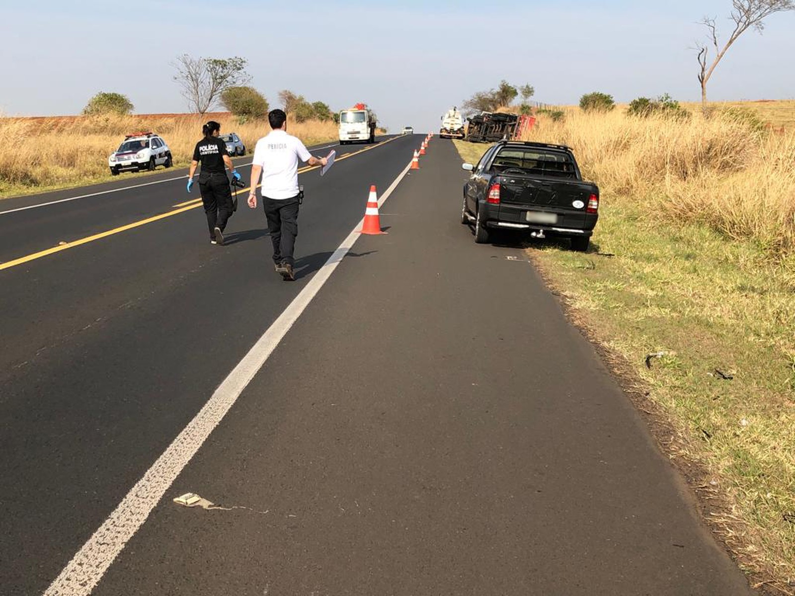 Ainda de acordo com o motorista, após o tombamento, e ao sair do caminhão, não avistou mais a pessoa que havia pendurado em seu veículo. Posteriormente, ao realizar o transbordo da carga, às 16h20min, foi localizado o corpo da vítima, identificada pelas iniciais F.C.V., de 37 anos, morador de Igarapava, ao lado do caminhão e embaixo da carga, em óbito.
