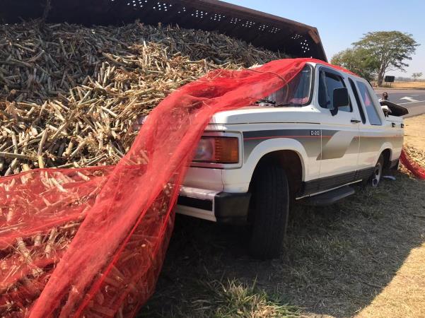 Módulo de bitrem estacionado com carga de cana tomba sobre camionete na SP-294