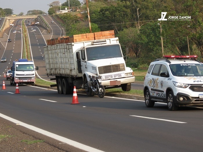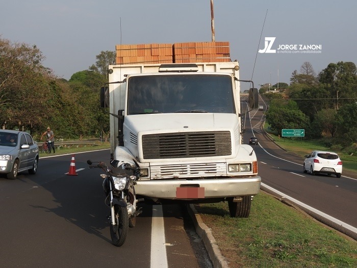 Moto fica enroscada em caminhão durante ultrapassagem na SP-294 em Dracena; piloto se feriu