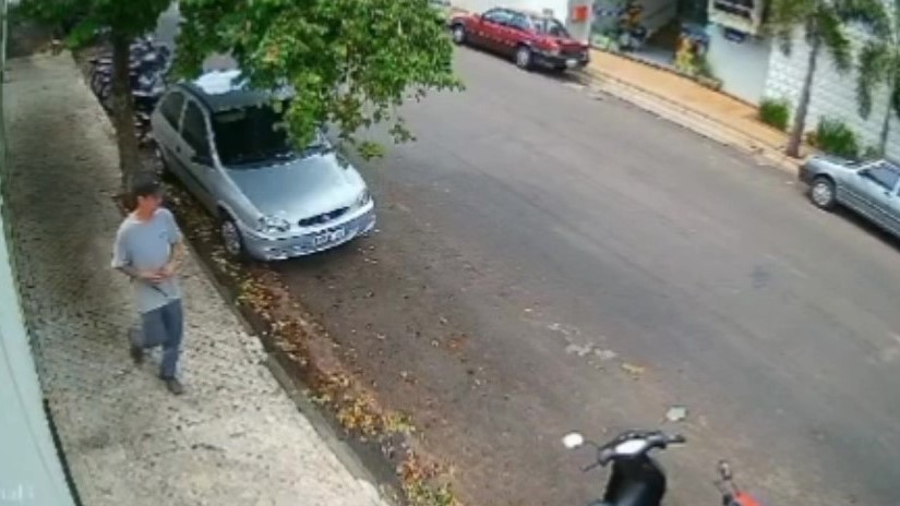 Na ocasião o autor do furto usava calça jeans, camiseta cinza e boné preto. Ele chegou até a moto e com uma "chave micha" abriu o compartimento do banco onde estava o capacete, vestiu o acessório e em seguida deu partida no veículo, deixando o local.