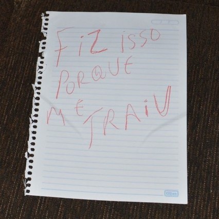 Bilhete deixado pelo agressor no local do crime (Cedida/Polícia Civil).