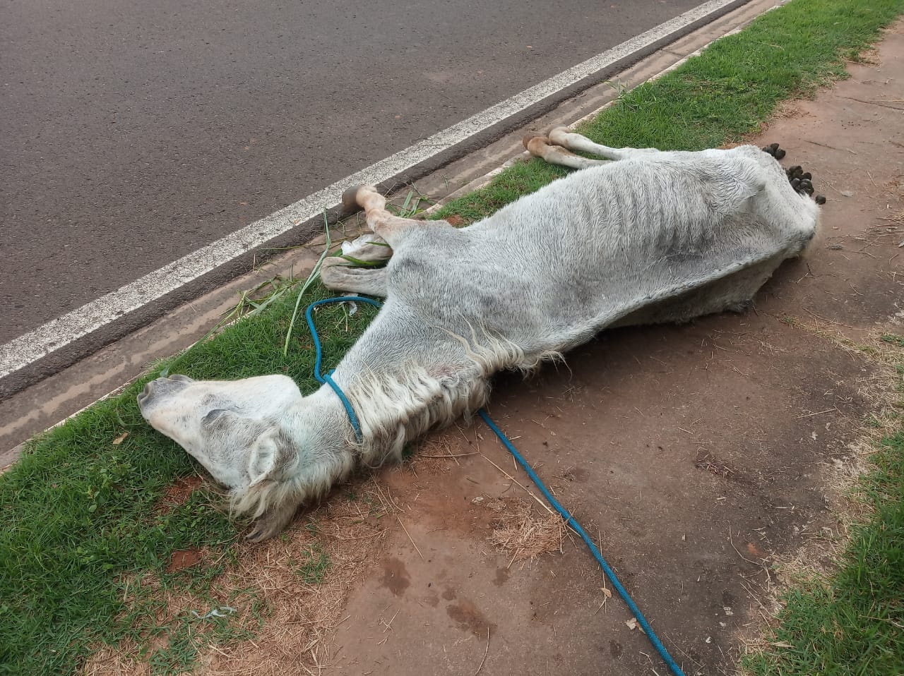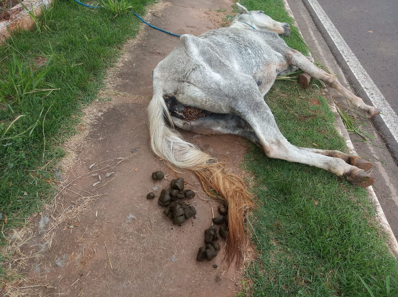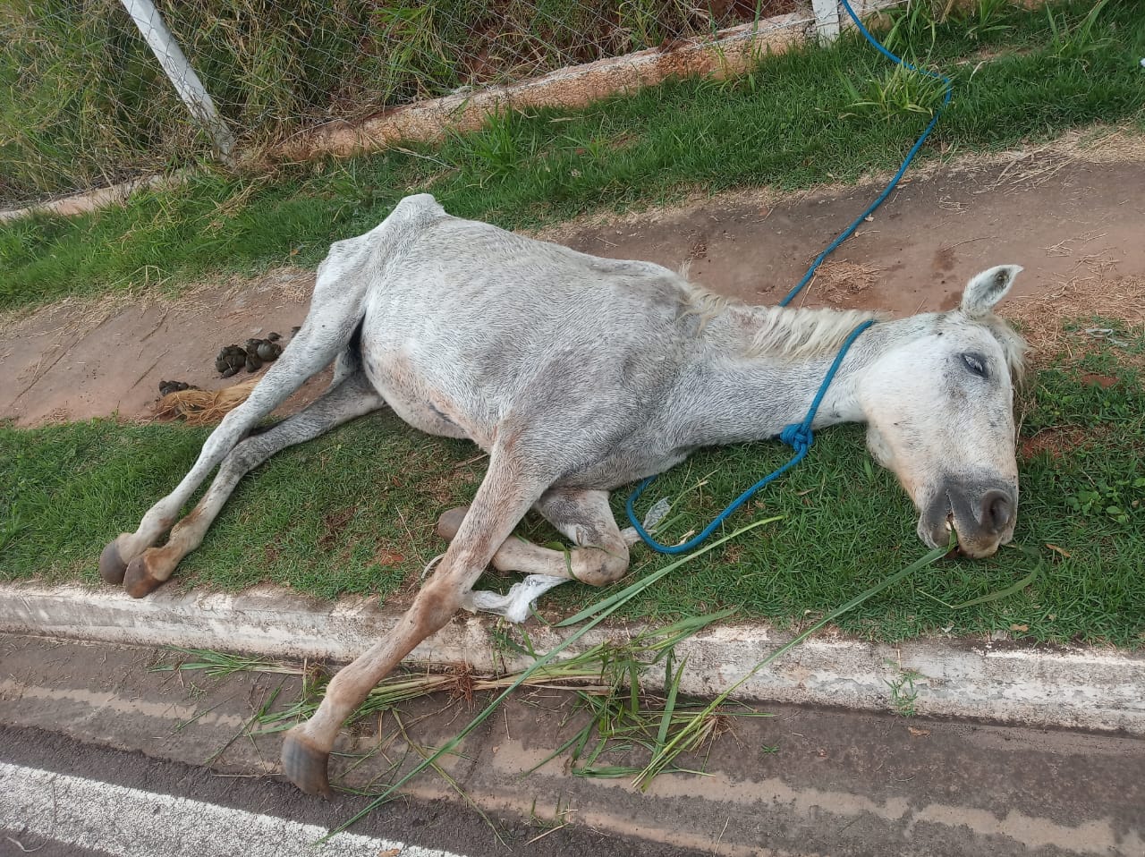Nesta terça-feira (9), a após tomar ciência de um vídeo publicado nas redes sociais a respeito de um equino que estaria debilitado, sem água e alimentação e sem condições de levantar, uma equipe da Polícia Militar Ambiental foi até uma área verde na Rua Maria Helena Ambrósio Rosa, no Bairro Vida Nova, em Presidente Prudente, verificar a denúncia de maus tratos a animal doméstico. No local havia uma égua caída ao solo, debilitada e magra, não conseguindo se levantar.