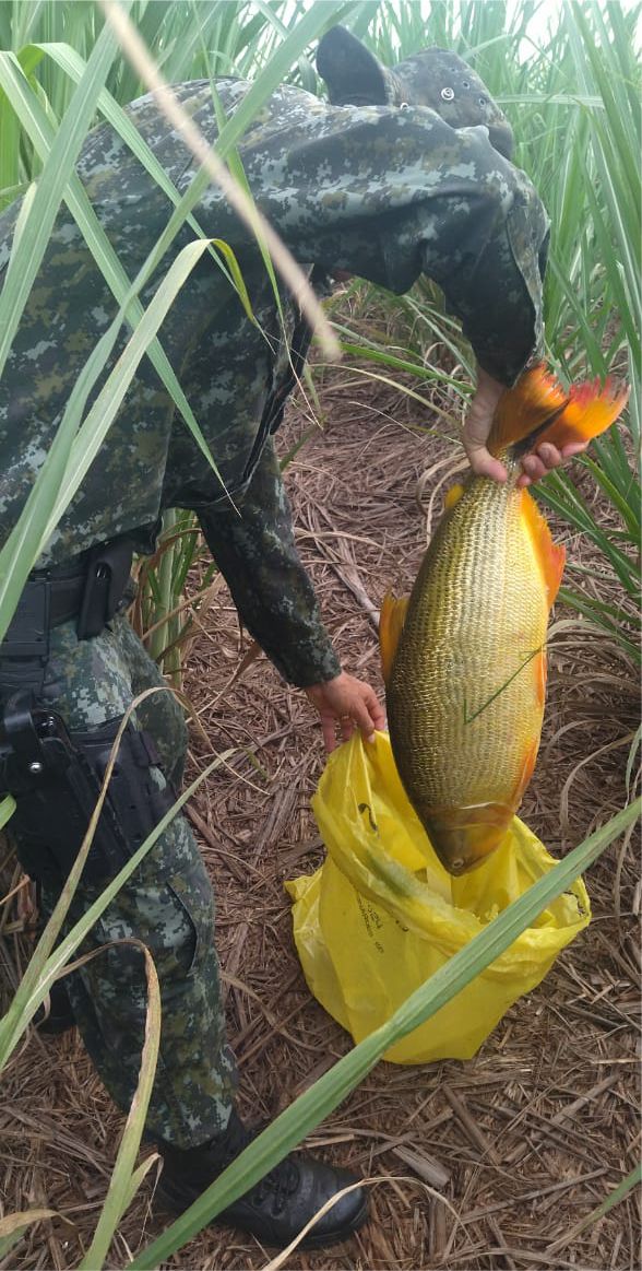 No interior do saco plástico abandonado pelo passageiro no canavial foi localizado um peixe da espécie dourado de 7,4 quilos, proveniente da pesca proibida devido ao período de piracema.