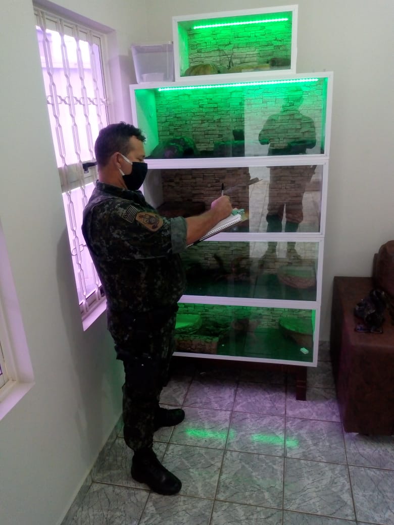 No local, as equipes constataram a manutenção em cativeiro de cinco serpentes exóticas, sendo uma piton, uma milk snake, uma king snake albina, uma king snake nigritus e uma corn snake. Segundo a PM Ambiental, os animais eram criados sem parecer técnico e licença da autoridade ambiental competente.