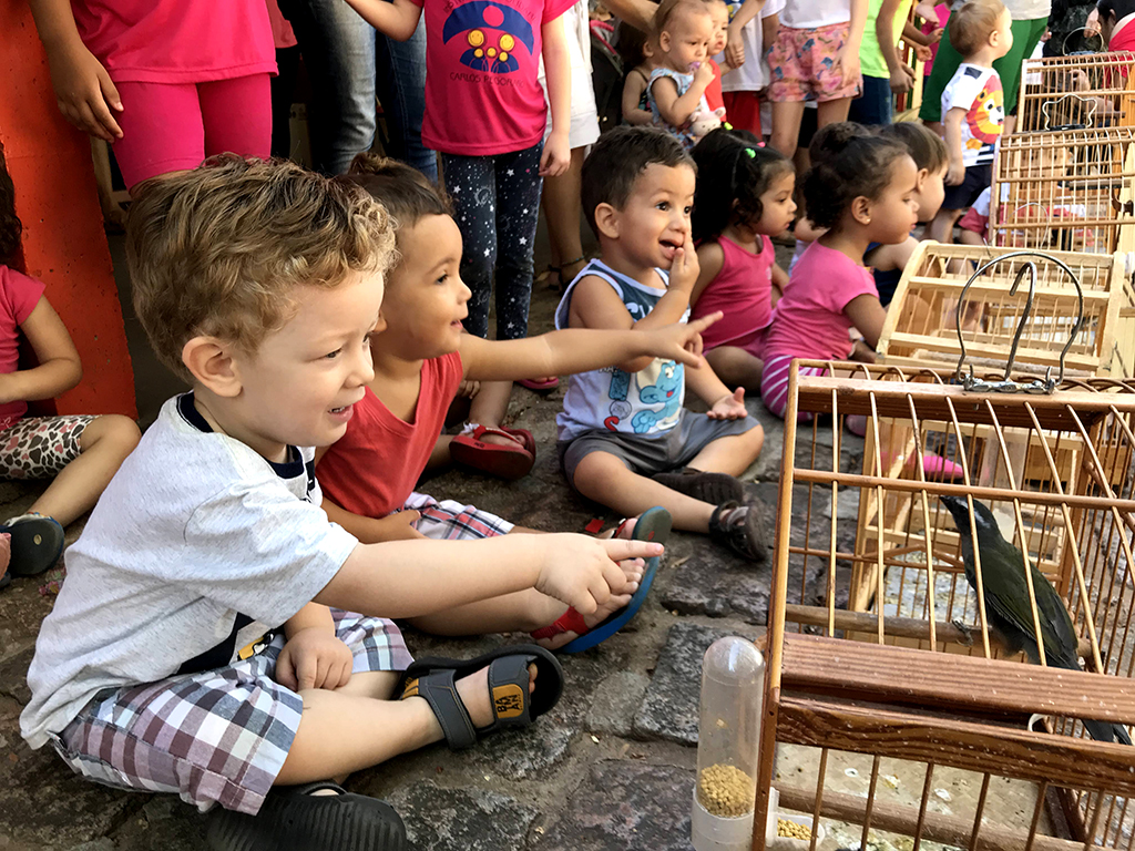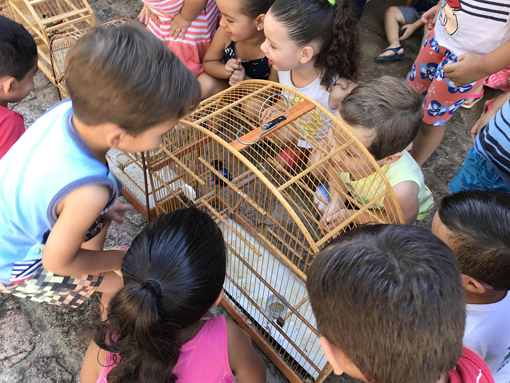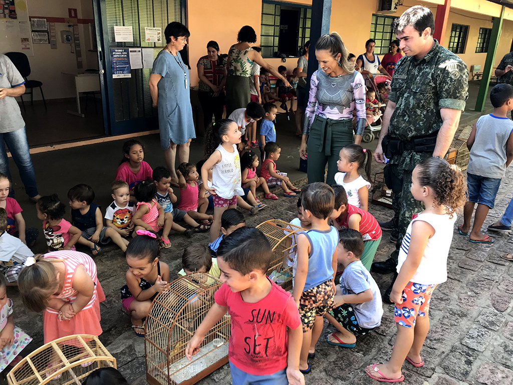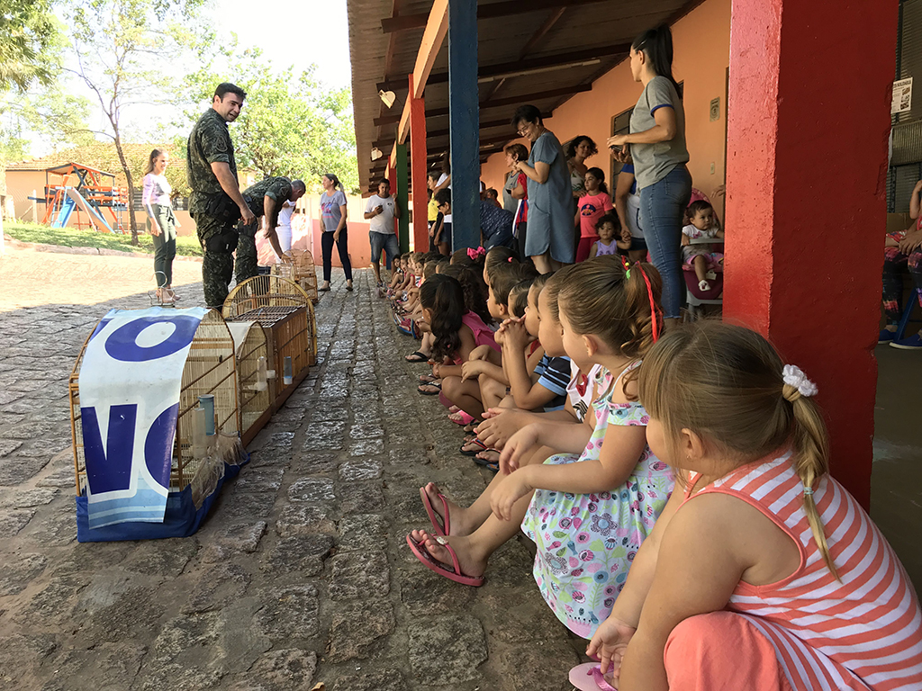 As crianças tiveram contato com os pássaros ainda em gaiolas, após o desembarque das viaturas, e puderam fazer a observação detalhada das espécies. Em seguida, o grupo se dirigiu a uma área de mata, ao lado da Instituição, onde foi realizada a soltura. (Continua após a publicidade...)