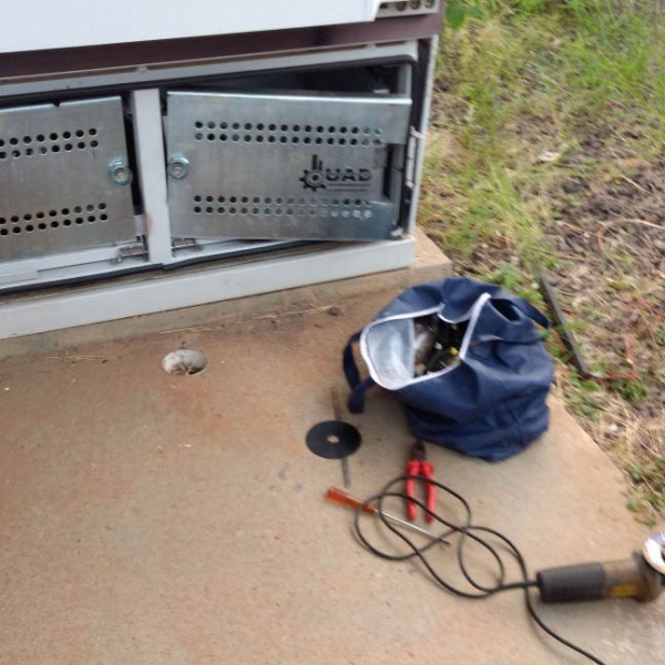 Imediatamente os policiais se deslocaram até a torre da Claro, e surpreenderam, em flagrante, uma dupla que realiza o furto no local. Eles utilizavam uma esmerilhadeira, usada para cortar os cadeados que fecham o contêiner, onde ficam armazenadas as baterias.