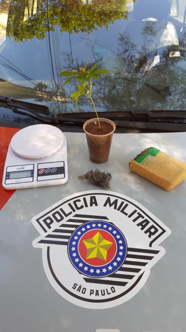 Com essa informação a equipe permaneceu em observação quando presenciou a chegada do suspeito ao local, momento em que desenterrou um tijolo de maconha e uma balança de precisão. Foi localizado ainda um pé de maconha que estava plantado em um copo descartável, localizado próximo ao local em que a droga estava ocultada. (Continua após a publicidade...)