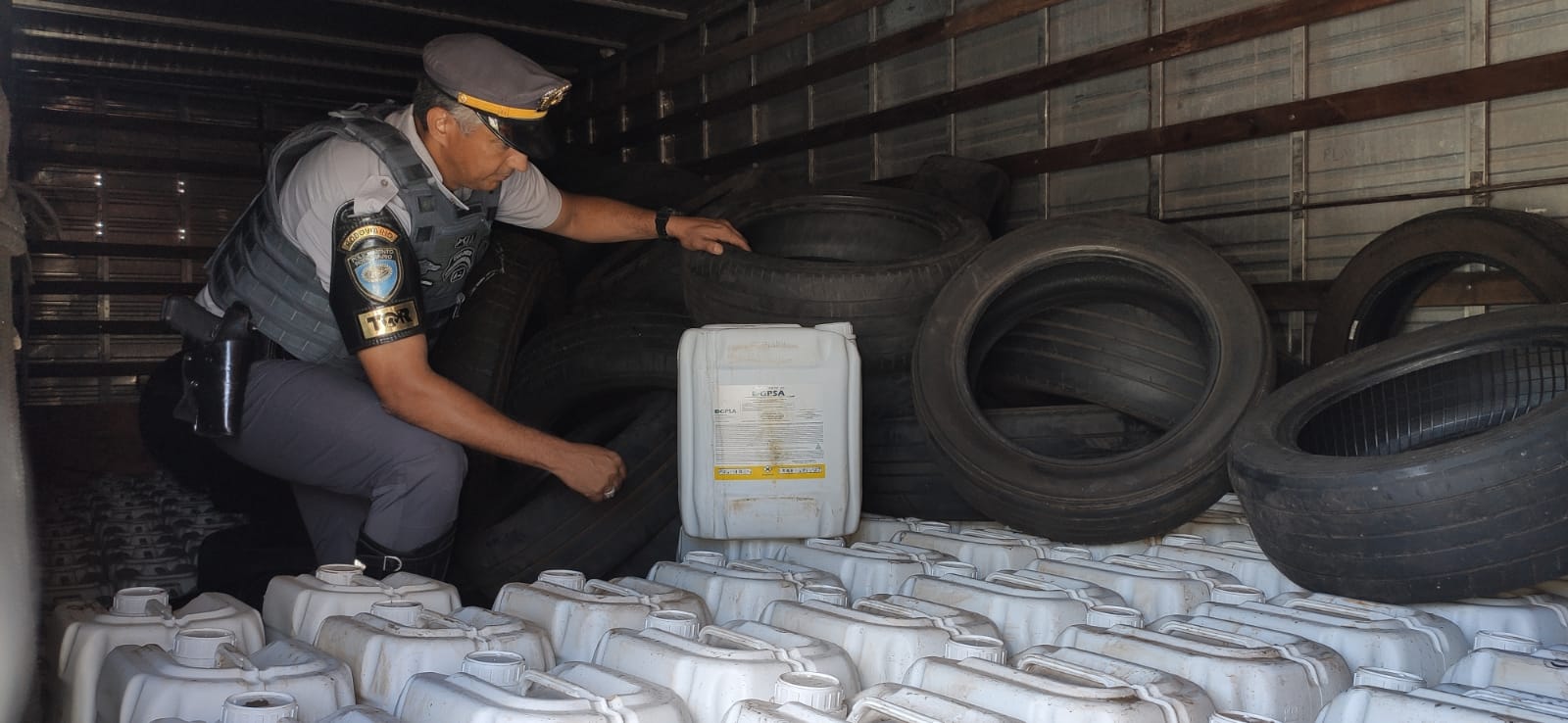 Conforme a PM Rodoviária, a mercadoria de origem paraguaia e proibida, estava escondida em meio a carga de pneus usados, distribuída em 500 galões de 20 litros cada, e tinha como destino o estado da Bahia.