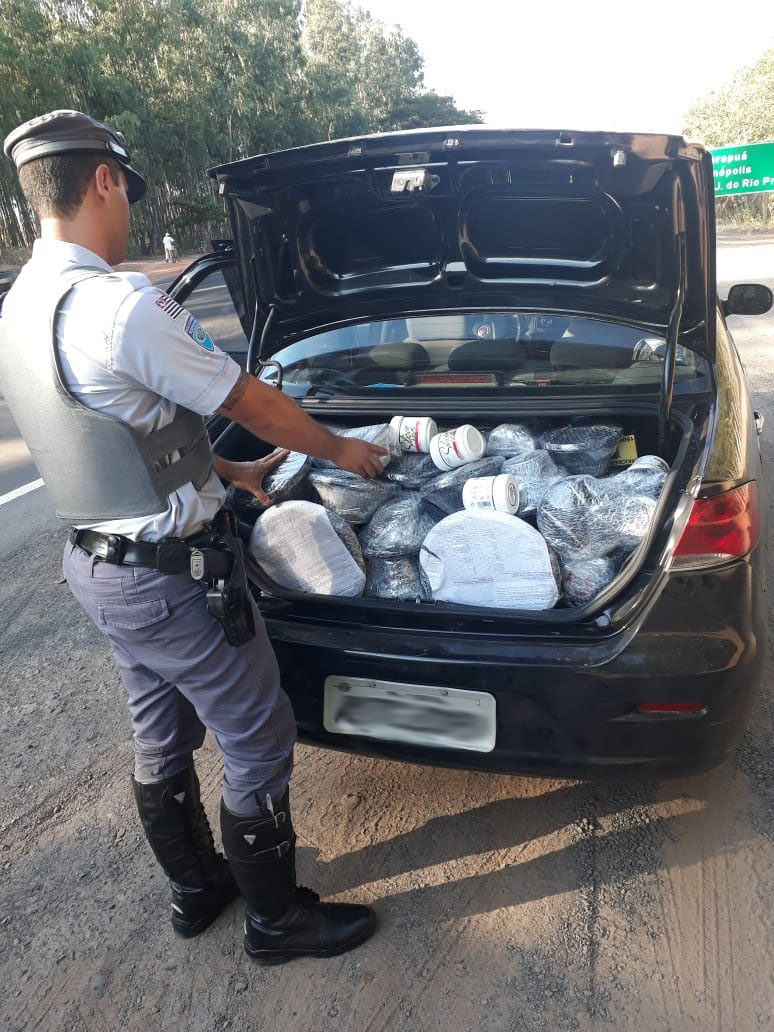 Segundo a PM Rodoviária, em fiscalização ao combate de ilícitos penais pela rodovia, a equipe de apoio operacional do Policiamento Rodoviário de Adamantina abordou um automóvel Fiat Siena com placas de Curitiba (PR), que transitava no sentido Martinópolis a Rinópolis, conduzido por G.M.V, 38 anos, amasiado, vendedor, morador de Itumbiara (GO), juntamente com o passageiro, N.D.S, 34 anos, casado, vendedor, morador de Buriti Alegre (GO). (Continua após a publicidade...)