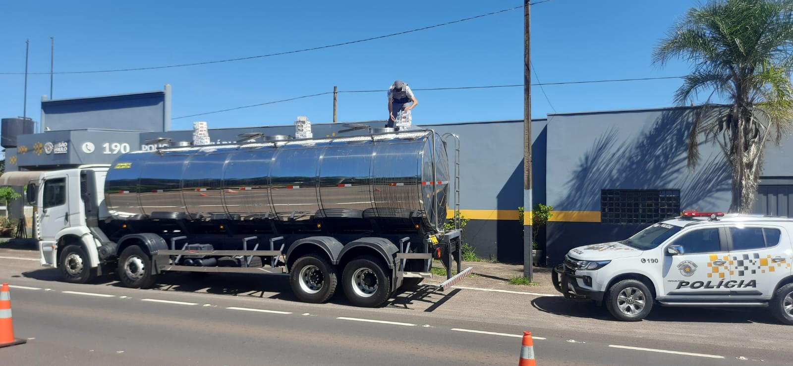 Durante o trabalho de patrulhamento nas estradas da região, uma equipe do TOR da Polícia Militar Rodoviária de Presidente Prudente abordou um caminhão tanque transportando uma carga de cigarros, de origem paraguaia, sem documentação fiscal.