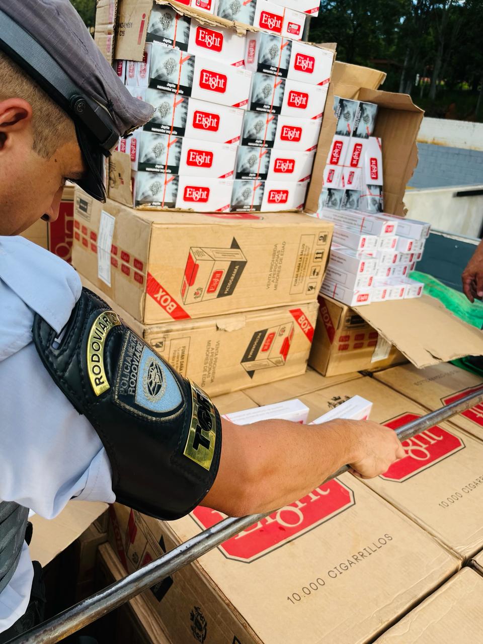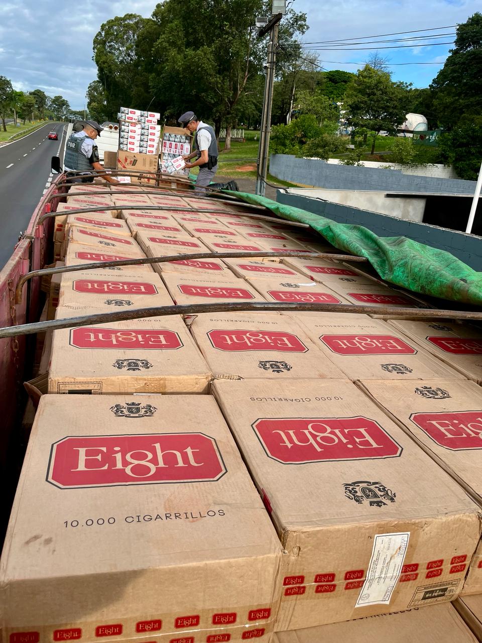 Uma carga com 475 caixas de cigarro da marca Eight, de origem estrangeira e sem documentação fiscal, foi apreendida pela Polícia Militar Rodoviária na tarde desta sexta-feira (29) na Rodovia Raposo Tavares, em Presidente Prudente. As 475 caixas correspondem a 475 mil maços de cigarro.