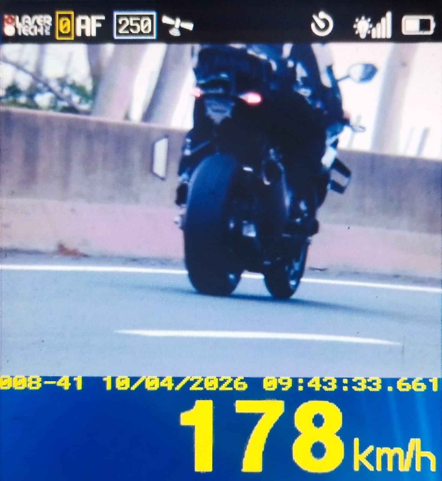 Minutos antes da abordagem, um dos motociclistas foi flagrado por radar trafegando em velocidade de 178 km/h. Para evitar a identificação, o condutor circulava sem a placa traseira, o que configura infração gravíssima. O veículo foi removido ao pátio.