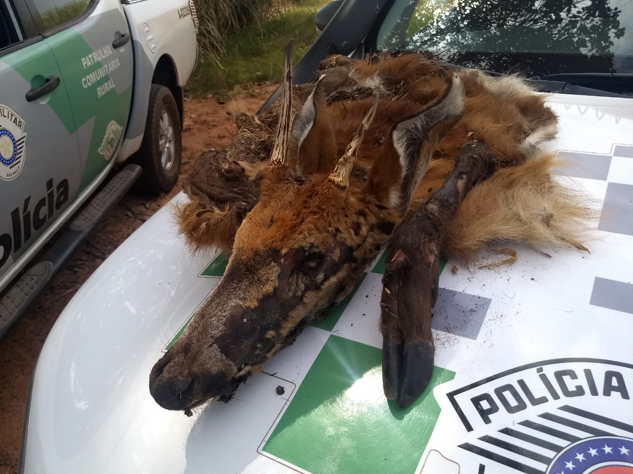 Em um paiol, foi localizada uma cabeça de veado mateiro “Mazama Americana” e no pasto um pedaço do couro e uma pata. Já em uma caixa térmica os policiais encontrarm partes de carne do referido material. (Continua após a publicidade...)