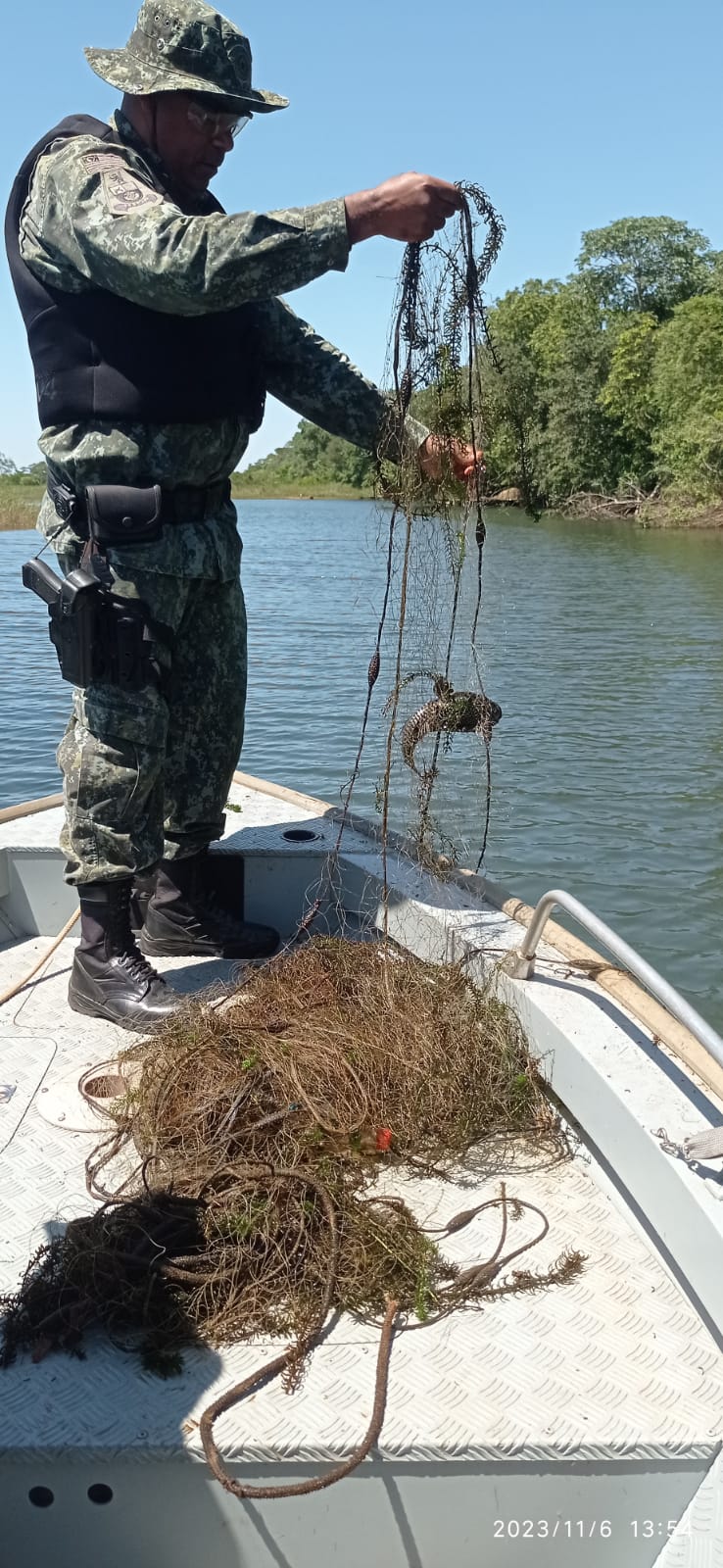 Já Rosana foram localizadas duas redes de emalhar totalizando 100 metros e dois covos artesanais para captura de iscas (camarão) no ambiente aquático, dispostas irregularmente devido o período de Piracema. O petrecho foi recolhido, apreendido e depositado na Base Operacional de Rosana para posterior destinação. Ainda durante a fiscalização em outro ponto do rio foi visualizada uma embarcação do tipo barco de alumínio com motor, onde seu ocupante realizava a pesca com caniço e molinete.
