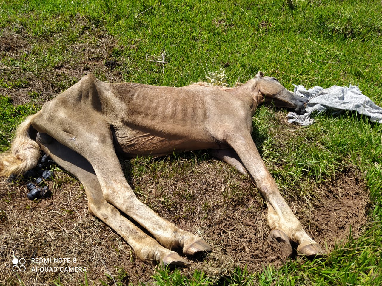 No pasto foi constatado o óbito da égua. Questionada, a envolvida disse que seu marido adoeceu e era ele quem cuidava dos animais, sendo que tem ido ao sítio em dias alternados para providenciar comida e água ao animal. Ela também informou que a égua já estava com idade avançada.