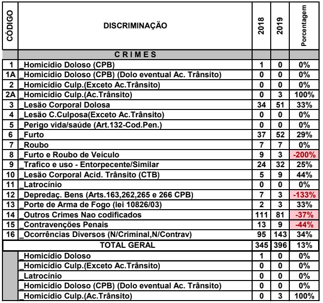 A depredação de bens também registrou queda substancial de 133% (com 3 registros em 2019 contra 7 em 2018). Os crimes de menor potencial ofensivo caíram 44% (sendo 9 casos em 2019 contra 13 casos no ano passado). As ocorrências de lesões corporais dolosas tiveram um aumento de 33% (com 51 casos neste ano, contra 34 em 2018).