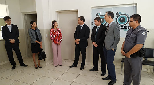 Dentre as autoridades que visitaram as instalações do “Projeto Hórus”, na última sexta-feira, estiveram presentes no evento os delegados de polícia Marcelo Marques Silva Lemes, Eder Silva Monarin, Patrícia Tranche Vasques e Rodrigo Pigozzi Alabarse (representando a Delegacia Seccional de Adamantina).