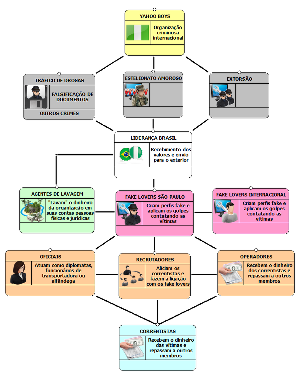A Polícia Civil conseguiu demonstrar como a organização criminosa era estruturada: existia a figura do “Fakelover” (responsável por contatar as potenciais vítimas). Outro ramo da organização era o denominado “o oficial” que se passava por funcionário da alfandega, diplomatas e outros. Haviam também a ala dos “recrutadores” de contas e também os “operadores” (aqueles que repassavam o dinheiro rapidamente entre várias contas, após o depósito, dificultando o rastreamento). Ligados a estes, os “correntistas” (que recebiam de 7 a 10% dos valores arrecadados somente para emprestar sua conta corrente e fomentar a operacionalização, proporcionando o aumento crescente dos crimes, como eixo necessário de um mesmo mecanismo). Por fim, os agentes da lavagem de capitais cuja finalidade é “esquentar”, ou seja, tornar o dinheiro ilegal em lícitos imóveis.