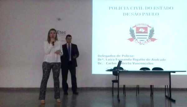 Nesta segunda-feira (5), os Delegados de Polícia Assistentes da Delegacia Seccional de Polícia de Adamantina, Dr. Carlos Roberto Vasconcelos e Dra. Laíza Fernanda Rigatto Andrade (abaixo), ministraram palestra na escola ETEC Professor Eudécio Luiz Vicente a respeito das carreiras policiais que integram os quadros da Polícia Civil, em especial a de Delegado de Polícia.