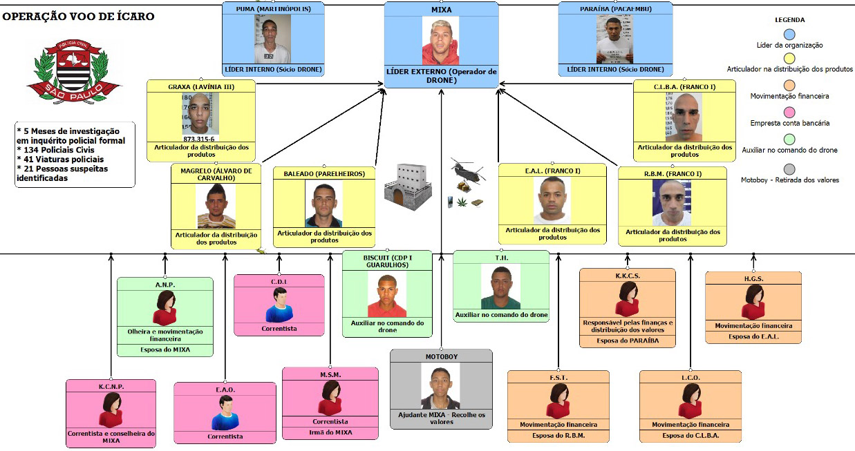 Estrutura da organização criminosa que operava esquema de drone (Reprodução/Polícia Civil).