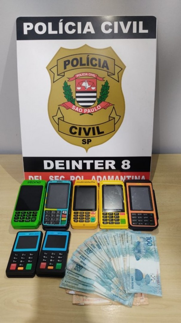No local, os policiais encontraram sete máquinas de cartões de crédito, usadas para realizar compras na internet com os cartões obtidos no golpe, e R$ 4,5 mil em dinheiro, resultado de saques em contas bancárias das vítimas.
