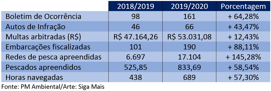 Segundo os resultados parciais computados até 26 de fevereiro, no período da Piracema 2019/2020 a PM Ambiental elaborou 161 boletins de ocorrência e 66 autos de infrações ambientais e R$ 53.031,08 em multas. Foram fiscalizadas 190 embarcações e apreendidos mais de 800 quilos de peixes pescados ilegalmente. Veja os dados completos no quadro: