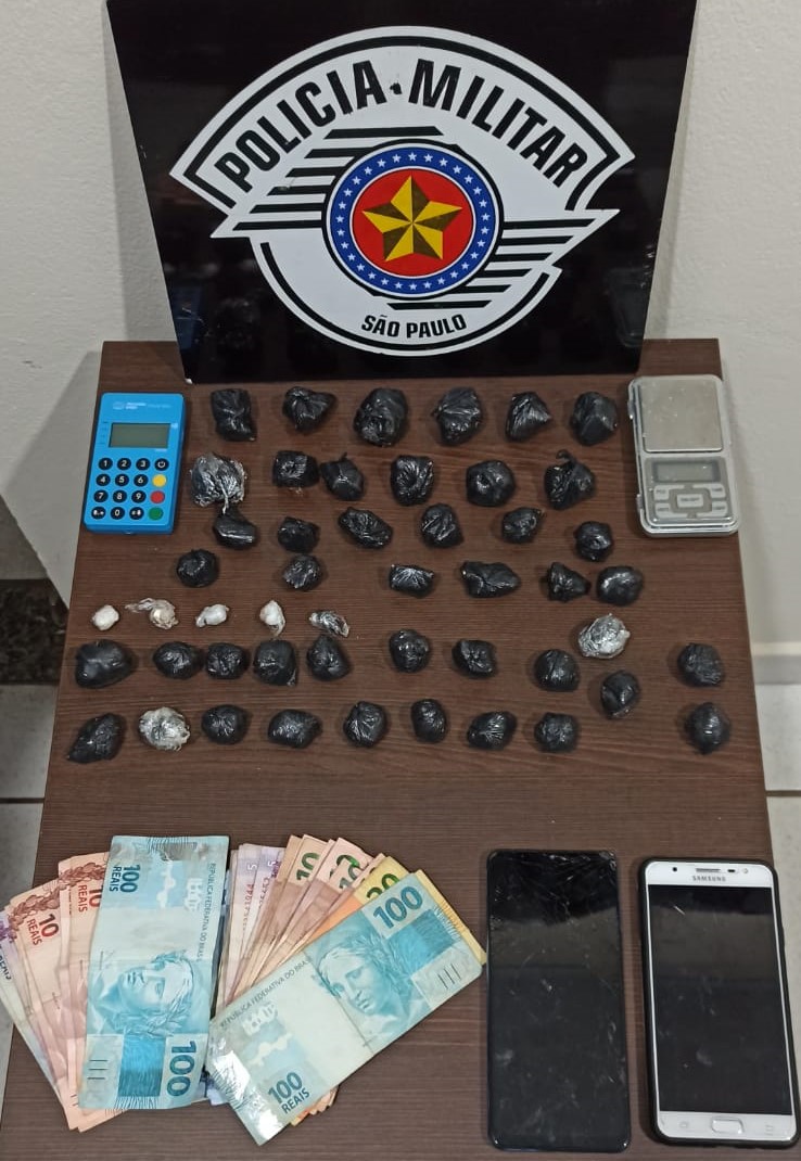 Foram apreendidos 199,65 gramas de crack, 118 gramas de cocaína, R$ 542,00 em cédulas diversas, dois aparelhos celulares, uma máquina de cartão, uma balança digital e uma motocicleta Yamaha Factor.