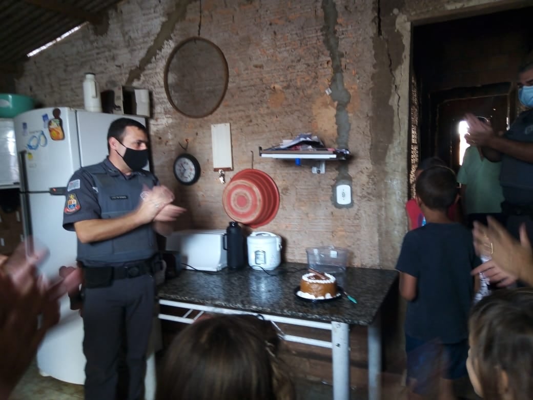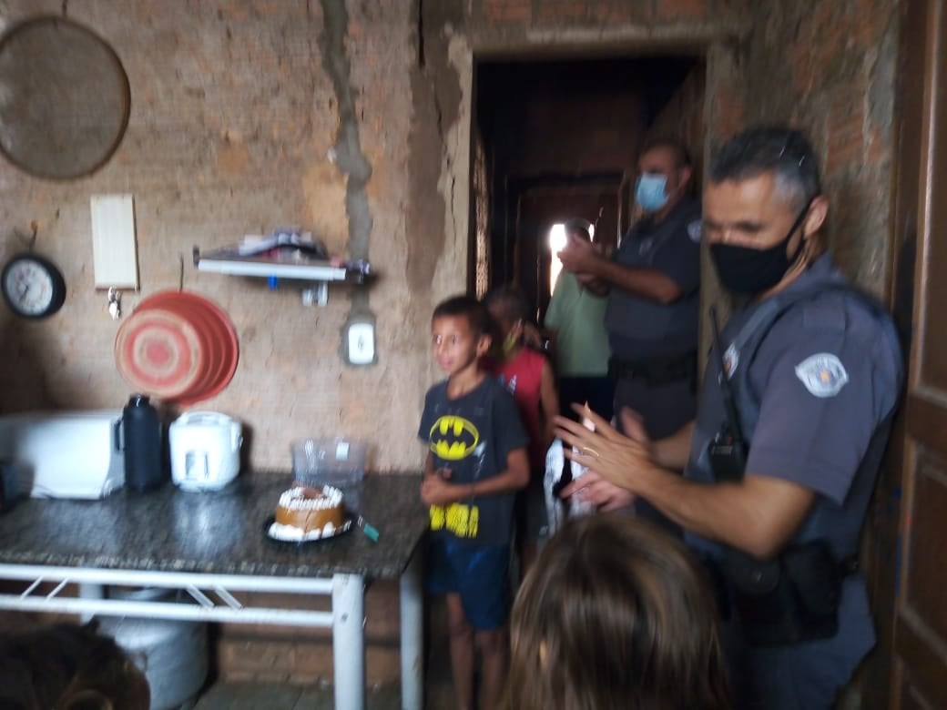 Policiais Militares levam bolo e comemoram o aniversário de menino de 9 anos no Jardim Brasil
