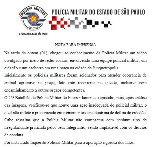 Em nota, o 25º BPM/I disse que tomou conhecimento do vídeo na tarde deste domingo por meio das redes sociais, envolvendo uma equipe policial militar, um cidadão e um cachorro em uma praça pública de Junqueirópolis. Segundo informa a nota, os policiais que aparecem no vídeo foram acionados para atender ocorrência de animal agressivo na praça, o que é recorrente na cidade, inclusive com encaminhamentos a outros órgãos competentes. (Continua após a publicidade...)