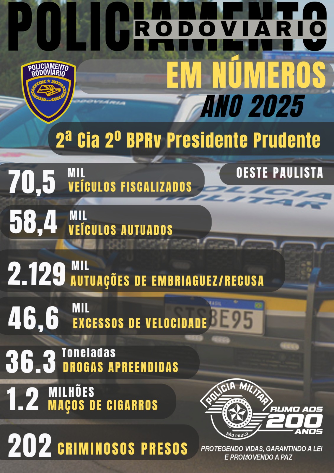 A Polícia Militar Rodoviária divulgou nesta terça-feira (7) o balanço das ações realizadas ao longo de 2025 pela 2ª Companhia do 2º Batalhão de Polícia Rodoviária (2º BPRv), responsável pelo policiamento na região de Presidente Prudente, no Oeste Paulista. Os números evidenciam a intensidade da fiscalização e o impacto direto no enfrentamento a infrações de trânsito e crimes nas rodovias estaduais.