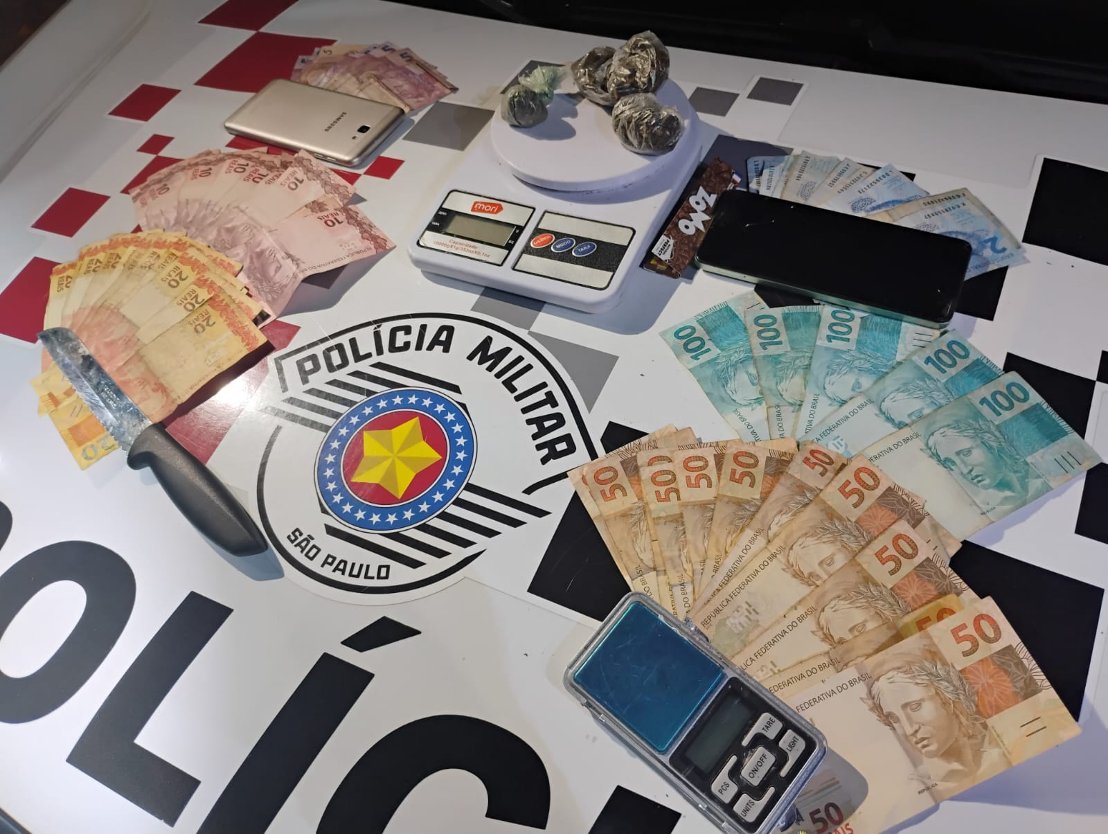 Na sequência, os policiais foram até a residência do suspeito inicialmente abordado. Com autorização da mãe para entrada no imóvel, conforme a PM, foi realizada vistoria no quarto do abordado. Em uma mochila localizada atrás da porta que dá acesso à parte lateral externa da casa, foram encontrados uma quantidade adicional de maconha; duas balanças, sendo uma de precisão; e uma faca utilizada para fracionamento do entorpecente.