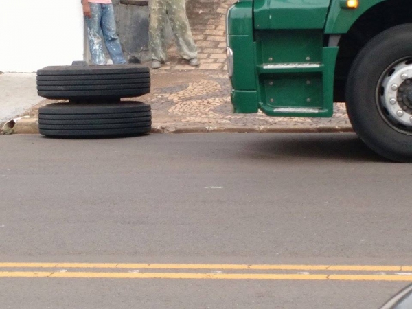 Duas rodas e pneus do eixo traseiro esquerdo de uma carreta tanque, que transitava no entorno da rotatória do Cristo, na Avenida Antônio Tiveron, se desprenderam do eixo e atingiram dois veículos e um poste da rede de energia elétrica.