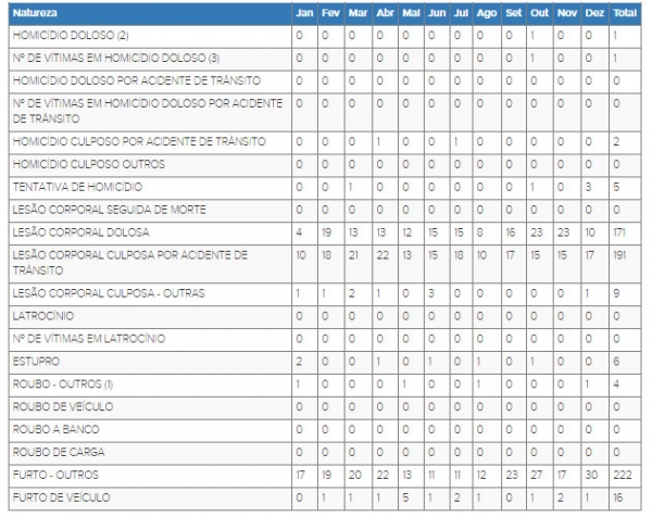 Os dados revelam também 222 ocorrências de furtos, 4 ocorrências de roubos e 15 registros de furtos e roubos de veículos.