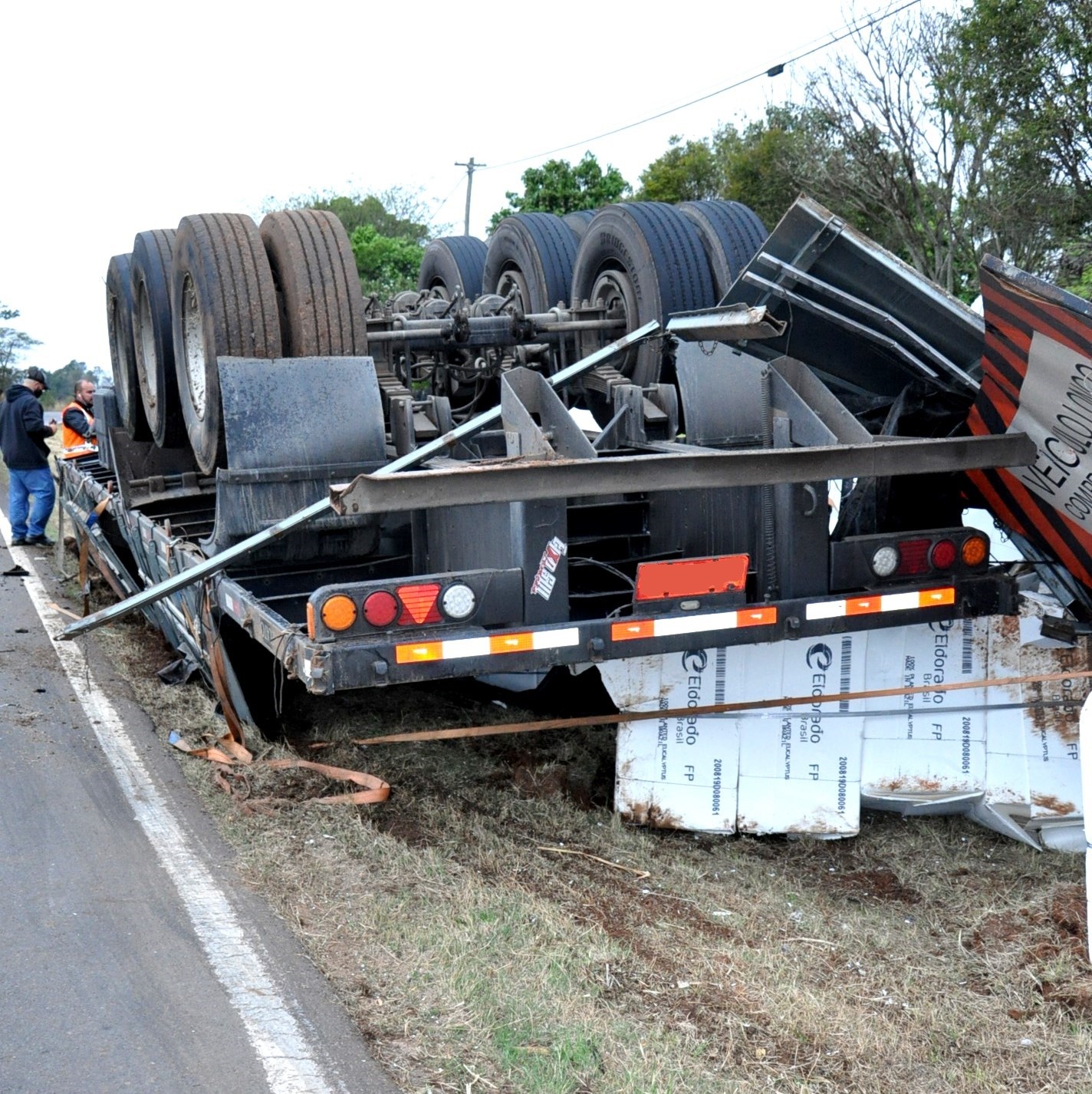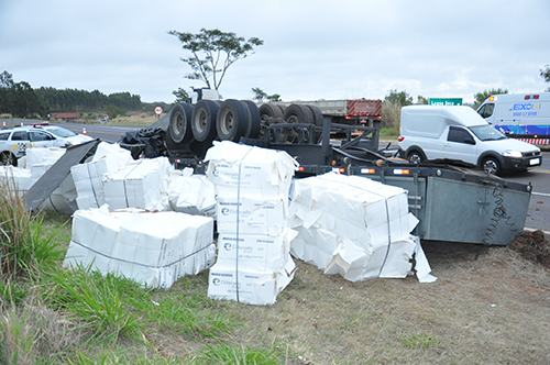 Um semirreboque com carga de celulose capotou na Rodovia Comandante João Ribeiro de Barros (SP-294), proximidades do trevo da Lagoa Seca, em Adamantina, na tarde desta quinta-feira (20). O dispositivo era o último de um conjunto de dois semirreboques que eram tracionados por um caminhão trator com placas de Ituporanga (SC).