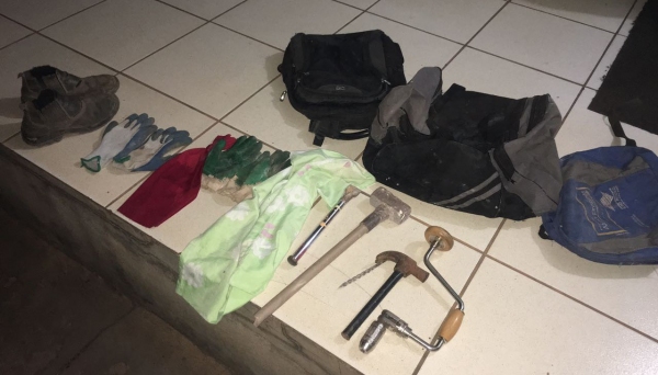 O passo seguinte foi acionar a Polícia Militar, quando o proprietário relatou o ocorrido. Imediatamente as equipes da PM se deslocaram até o local, realizaram cerco nas imediações e ao transpor o muro de acesso, encontraram uma bolsa contendo várias ferramentas (arco de pua, talhadeira, marreta e martelo).