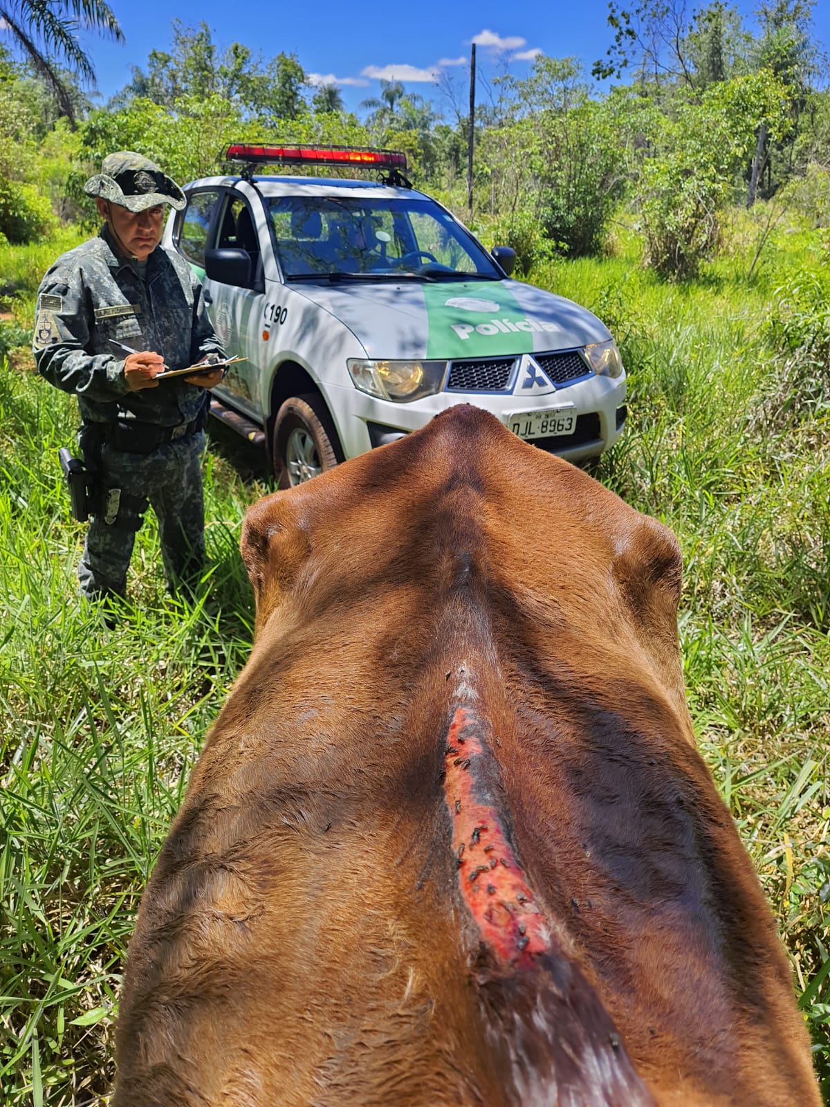 No local, um sítio no município de Rosana, a equipe confirmou que o possuidor do equino, um homem de 62 anos, estaria colocando a égua para trabalhar, estando fraca, ferida e com mais da metade do período de gestação.