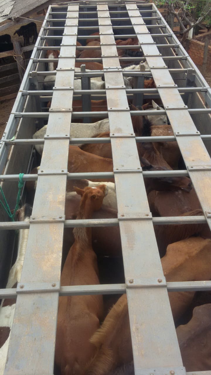 Animais estavam machucados e alguns com a cauda amarrada à carroceria do caminhão.