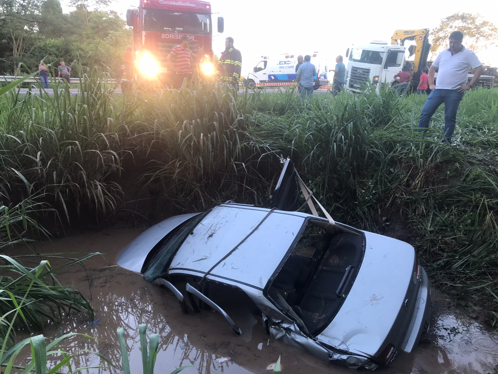 Ainda de acordo com a reportagem, após a colisão o Fiat Sena foi parar em uma grande poça de água das chuvas que ficou represada às margens da rodovia. O carro ficou parcialmente submerso e o condutor retido em seu interior.