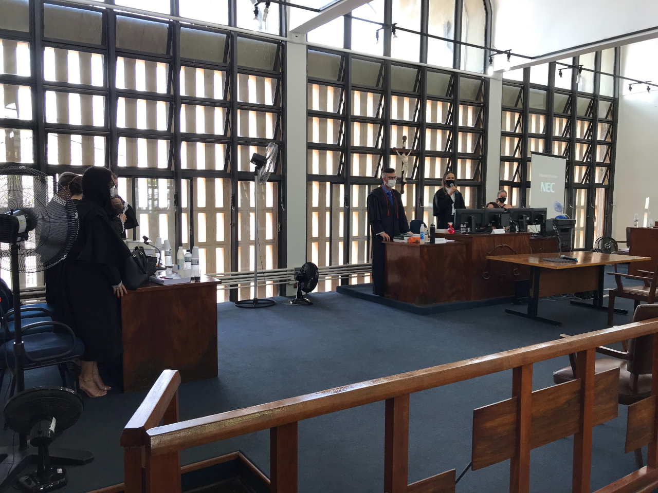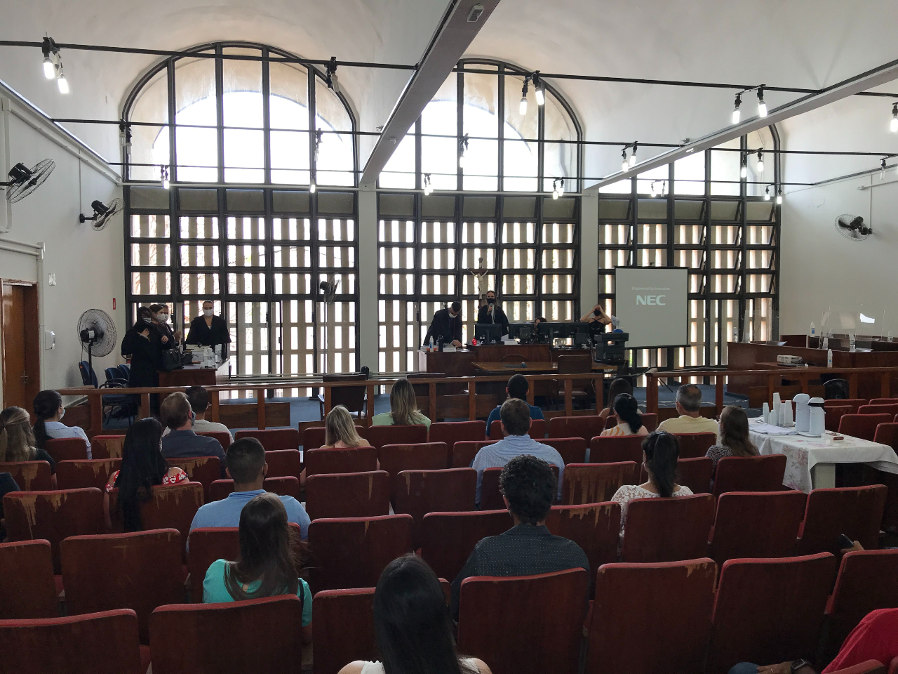 A sessão do Tribunal do Júri foi iniciada às 9h. Diferente de julgamentos anteriores, em razão das medidas restritivas e de distanciamento social, o local recebeu apenas dois representantes dos familiares da vítima e do réu, e profissionais da imprensa. Fora isso, presença apenas de pessoal ligado aos serviços do Fórum e das polícias Civil e Militar.