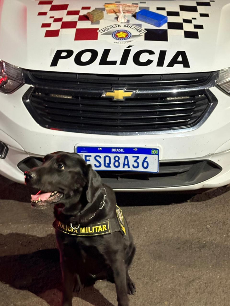 Na sequência, os policiais realizaram uma vistoria detalhada no interior do veículo e acionaram o Canil da Polícia Militar para apoio na busca por possíveis drogas. Durante a varredura, o cão farejador indicou a presença de entorpecentes no painel do lado do passageiro, onde foram encontrados dois tabletes de substância esverdeada aparentando ser maconha.