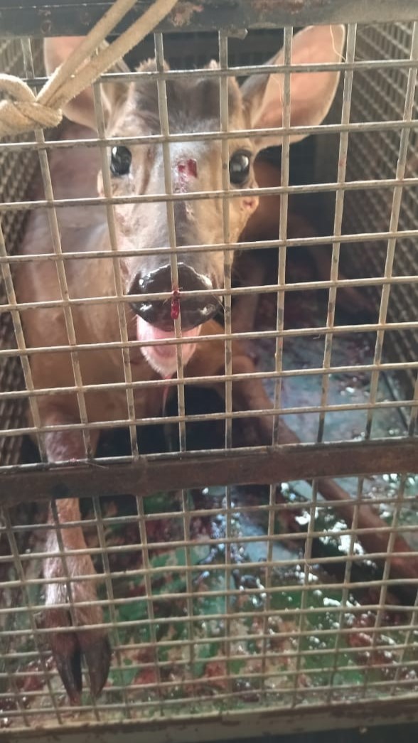 Veado-mateiro aparece machucado em loja de Dracena e é resgatado pela PolÃcia Ambiental