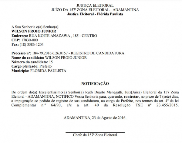 Em decisão da Justiça Eleitoral da 157ª Zona Eleitoral da Comarca de Adamantina, publicada ontem (23), foi impugnada a candidatura de Wilson Fróio Júnior (Coligação Por Amor a Flórida PMDB / DEM / PTB / PRB / PSB / PV / PSC / PSDC / PROS / PR / PDT), candidato a prefeito de Flórida Paulista.