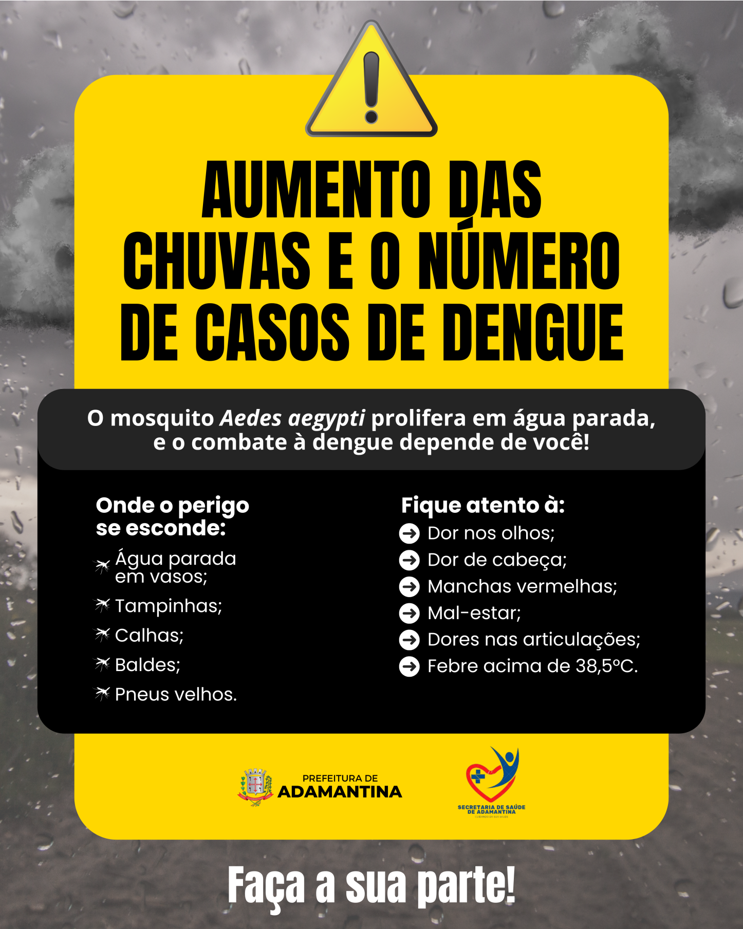 Isso porque, conforme o Climatempo, há previsão de chuva para os próximos dias, o que pode resultar em acúmulo de água e favorecimento dos criadouros para o mosquito Aedes Aegypti.