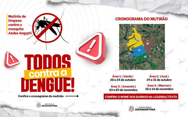 A Prefeitura de Adamantina, por meio da Secretaria de Saúde em parceria com a Secretaria de Obras e Serviços, realiza a partir desta segunda-feira (20), um novo mutirão para coleta de materiais inservíveis, como parte das ações de combate à dengue, zika e chikungunya.