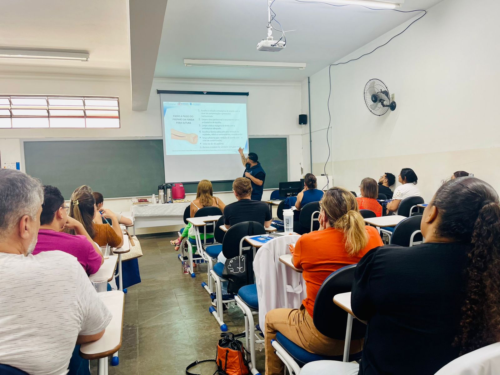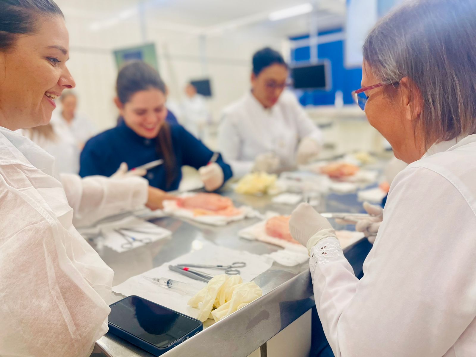 A formação ocorre na sala 1 do bloco II, no câmpus II da instituição, além do laboratório de anatomia, reunindo profissionais selecionados estrategicamente para que o conhecimento adquirido seja aplicado diretamente no atendimento à população. O exercício prático de suturas é realizado em cortes de frango, para simular situações reais de manuseio.