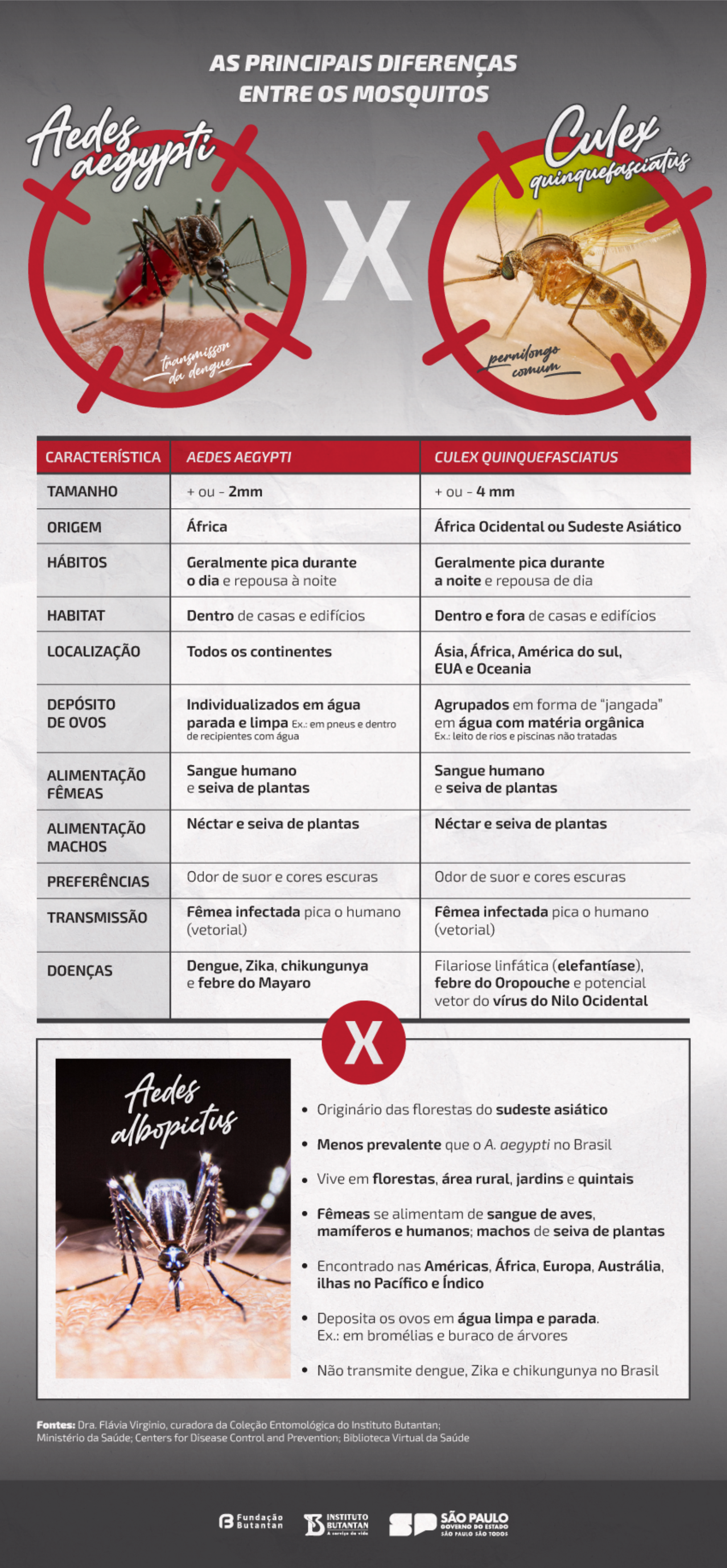 “O tamanho corporal muda conforme o sexo, sendo em geral fêmeas maiores do que os machos. Considerando minha experiência, vendo diariamente mosquitos das três espécies, em geral, o Culex quinquefasciatus costuma ser mais ‘robusto’ e maior que os Aedes aegypti e Aedes albopictus”, explica Flávia. Porém, essas características podem variar se um exemplar de uma espécie comer mais do que o da outra durante a fase larval. “Certamente o que comeu mais será maior do que o que comeu menos”, reforça.