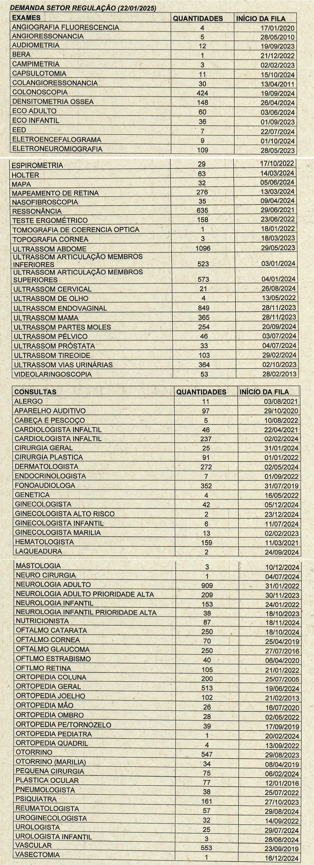 No documento consta uma lista com a fila de espera por exames e consultas médicas. Entre os principais destaques, os pedidos mais antigos são por exames de angioressonância, um teste de imagem que possibilita a avaliação não invasiva dos vasos sanguíneos. São cinco pacientes que aguardam pela sua realização. O pedido mais antigo, para o exame, é de 28 de maio de 2010, prestes a completar 15 anos.