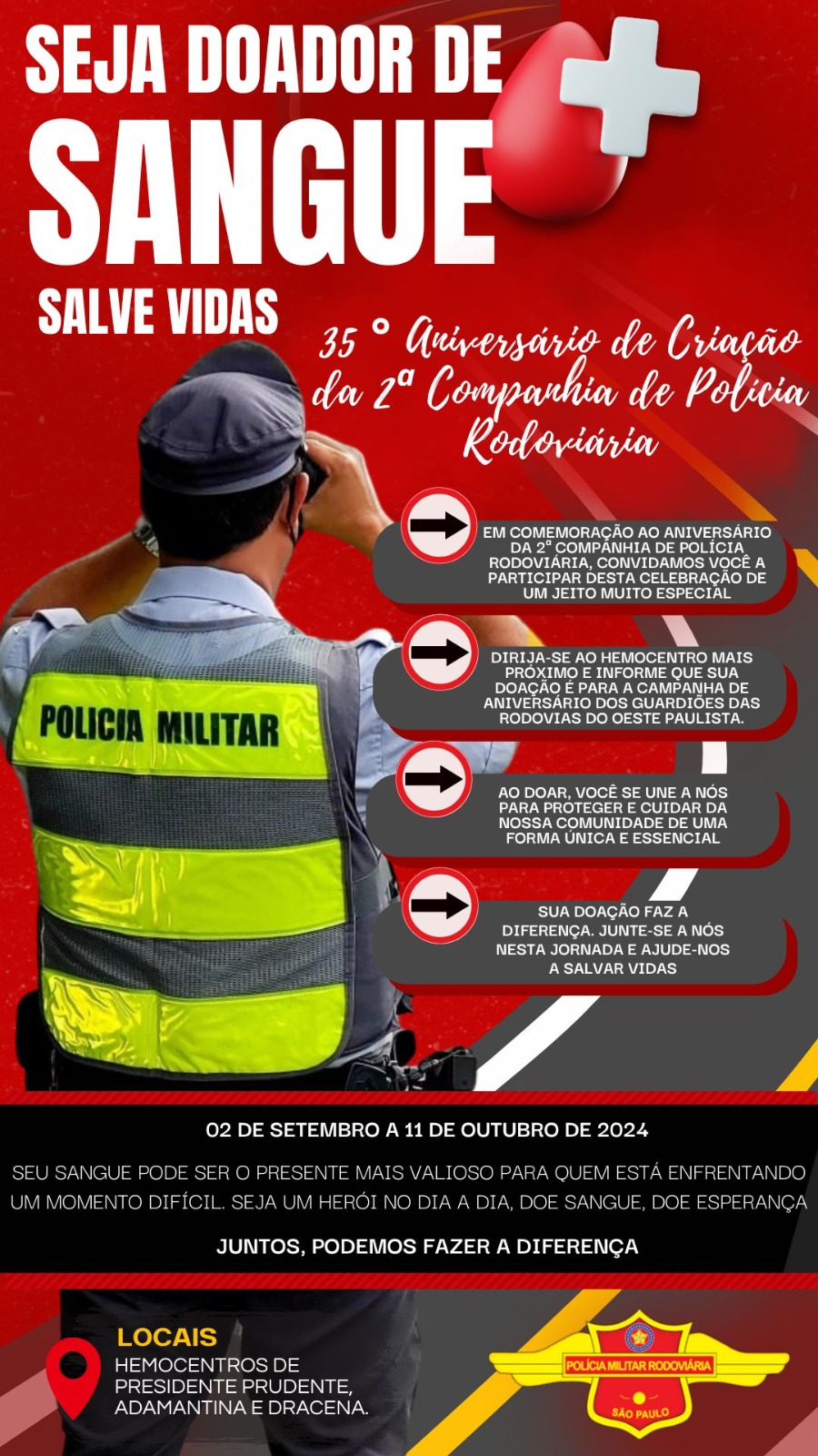 Em comemoração ao seu 35º aniversário de criação a ser celebrado no dia 6 de outubro, a 2ª Companhia de Polícia Rodoviária, com sede em Presidente Prudente, promove uma campanha de doação de sangue.