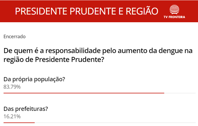 A enquete do G1 ficou disponível para votação no período de 22 a 28 de janeiro deste ano, com a pergunta “de quem é a responsabilidade pelo aumento da dengue na região de Presidente Prudente?”. A ferramenta, que não possui caráter científico, recebeu 5.089 votos.