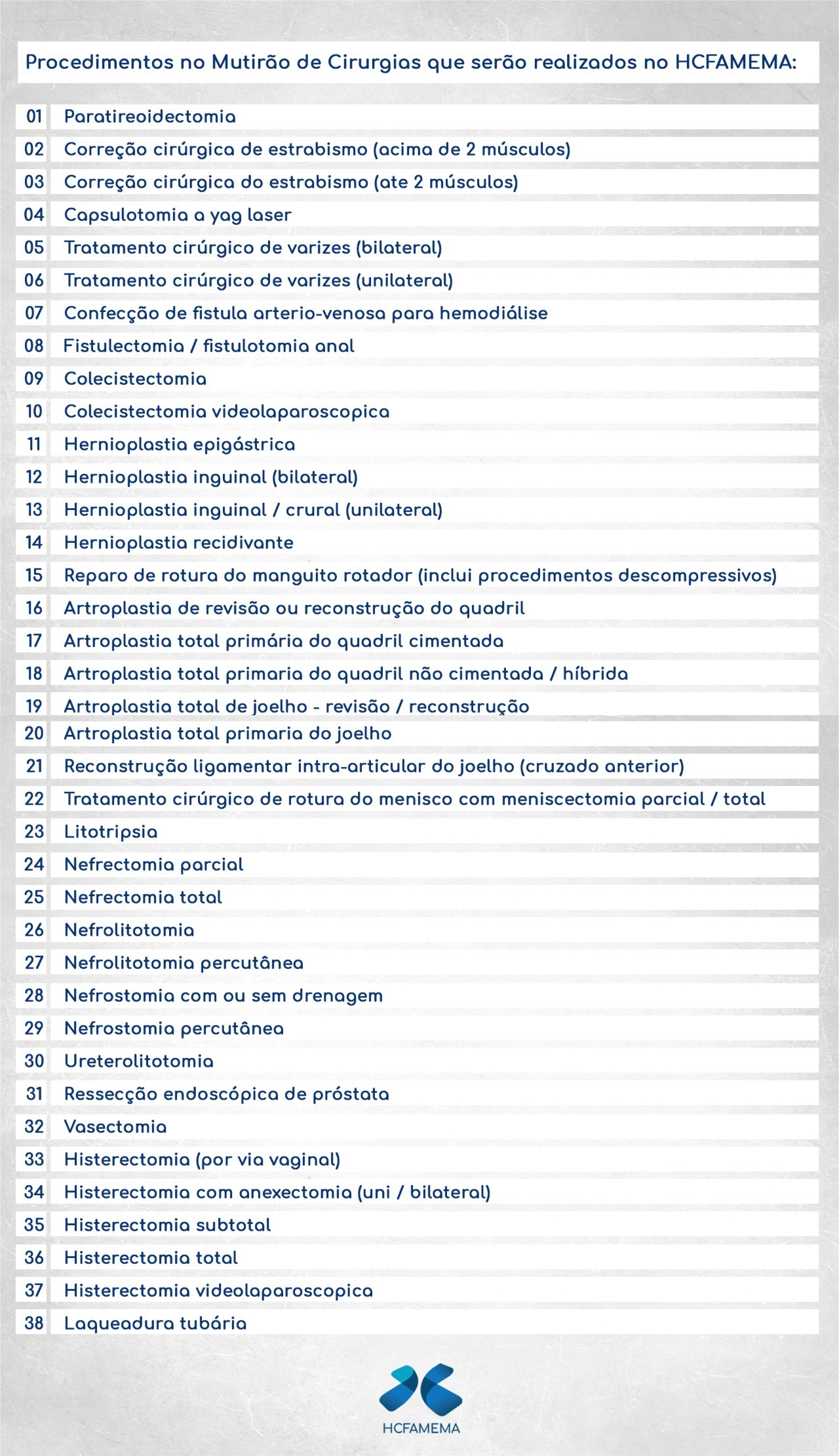 A primeira convocação é composta por pacientes que já foram avaliados pela equipe de assistência, possuem exames pré-operatórios dentro da validade e, na grande maioria dos casos, não necessita de novas consultas. No HCFAMEMA as cirurgias serão realizadas em 38 das 54 modalidades cirúrgicas autorizadas.
